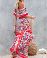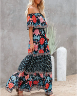 Cette Hippie Robe Longue Fleurie Bohème assume totalement son côté bohémien et joue avec ce motif. Son Col Bateau apporte beaucoup de sensualité car les épaules sont dévoilées et elle dispose d'une longue jupe qui arrive en bas des pieds, assortie de superbes motifs à fleurs très colorés.