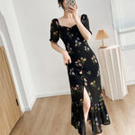 La coupe ancienne de cette Robe Femme Fleurie mousseline de Soie Rétro est remise à la page grâce à sa couleur sobre et chic : le noir ! De ce fait, les motifs floraux délicatement colorés sont mis en avant. De plus, la forme sirène de la robe ainsi que sa transparence sur la bas de la jupe ajoutent toute la sensualité qu'il manque parfois dans les pièces rétro classiques.