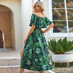 L'été est la période pour tout oser et mettre des couleurs vives, c'est pourquoi, nous vous proposons cette superbe Robe Fleurie Femme Verte aux épaules dénudées grâce à son col bateau magnifique, sa coupe bohème aux motifs tropicaux, elle est idéale pour les périodes estivales.