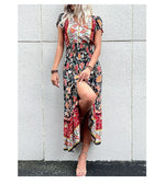 Cette Robe Longue Fleurie Champêtre en apparence simple avec sa coupe longue mais offre un charme bohémien grâce à ses motifs floraux colorés et délicats. Ajoutez à cela les petits Boutons sur son col en V et sa jolie fente avant qui dévoile subtilement les jambes. Alors toujours aussi simple ?