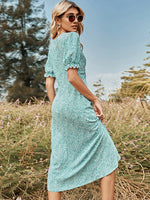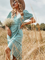 A l'esprit champêtre cette Robe Bleue à Fleurs dispose d'une coupe flatteuse inspiration portefeuille, qui de ce fait convient à la plupart des morphologies. Ses petites manches bouffantes, sa couleur ainsi que le détail des boutons pour fermer la robe accentuent le côté romantique et bohème de ce modèle qu'on aime tant.