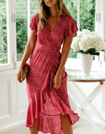 Avec cette Robe Fleurie Rouge Portefeuille Mi-Longue, chaque journée devient une occasion de rayonner avec naturel et élégance.